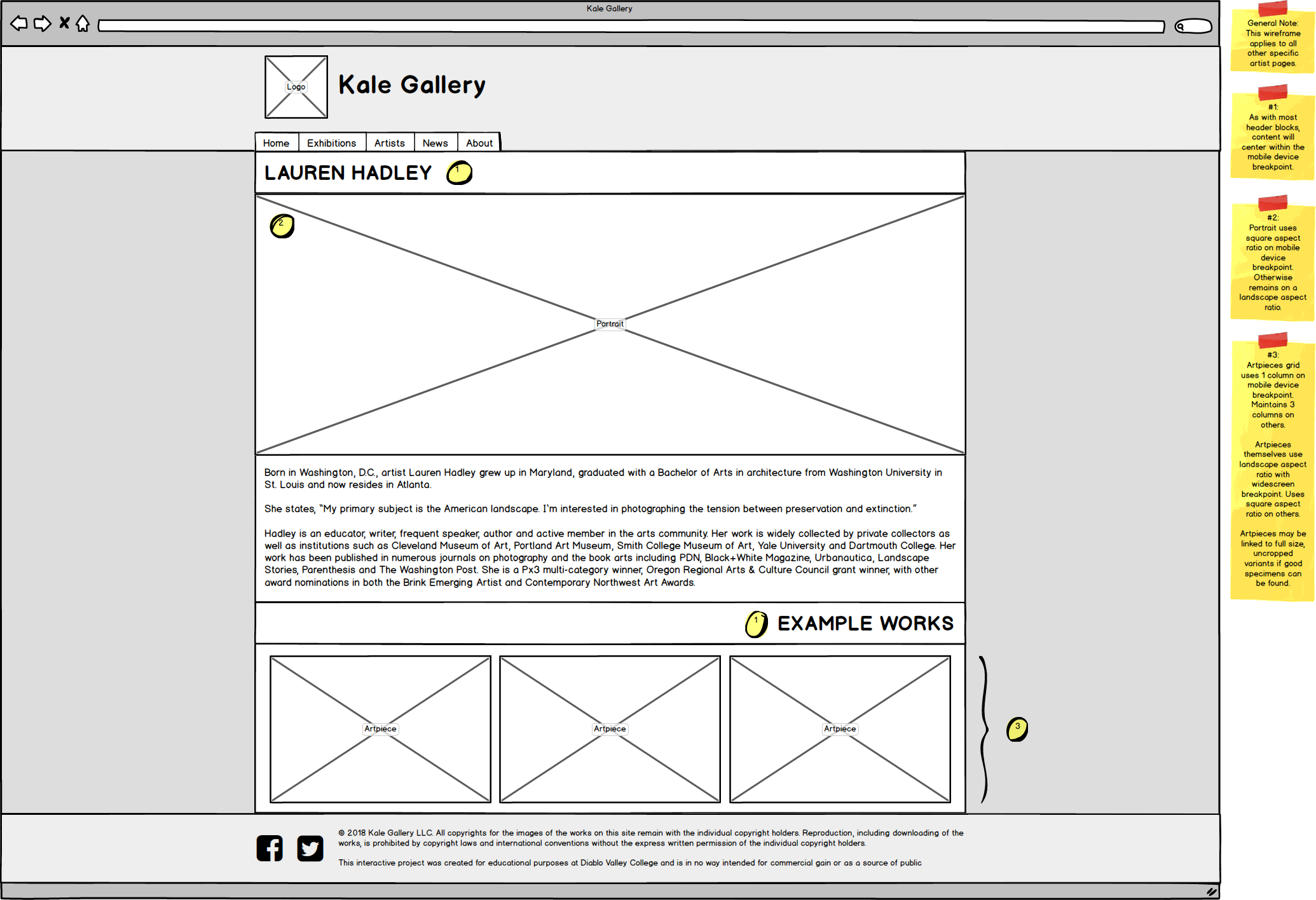 The colors were kept the same here to keep with the Kale Gallery appearance. However, elements are introduced to give the site a greater sense of detail and depth. The sidebars that appear in widescreen displays are replaced with a subdued artpiece as a background. Drop shadows are used to emphasize layering and break apart the flat aesthetic without departing too far from it. A subtle noise grain is added to boxes with a similar purpose.
